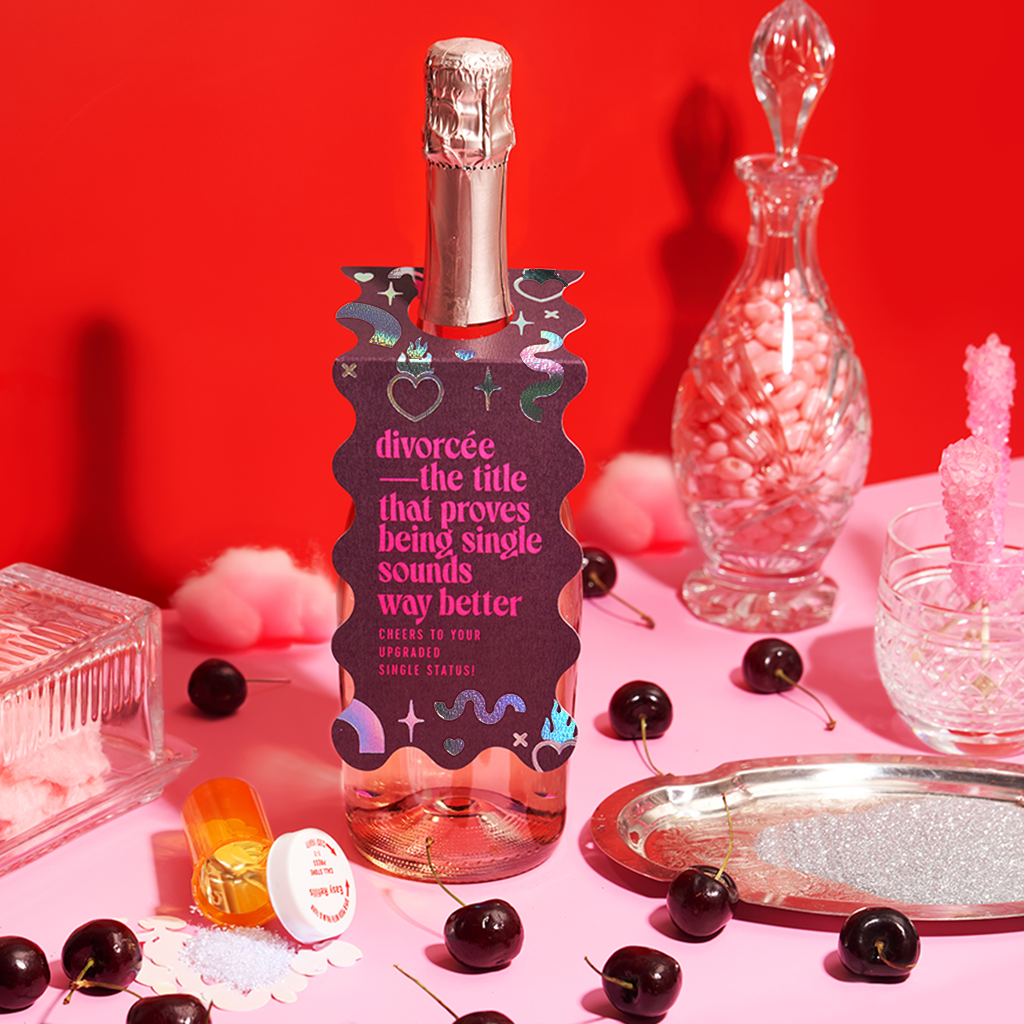 Le divorce est loin d'être une fin, c'est un nouveau chapitre glorieux – et une raison de trinquer. Cette étiquette est idéale pour célébrer le nouveau départ de votre meilleure amie avec du papier luxueux, des dorures holographiques et une pointe d'humour. Parce que chaque étape importante mérite d'être soutenue et d'un peu d'éclat.